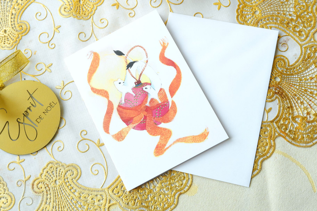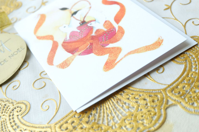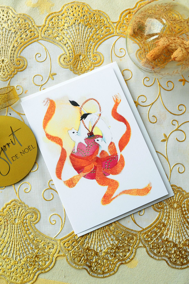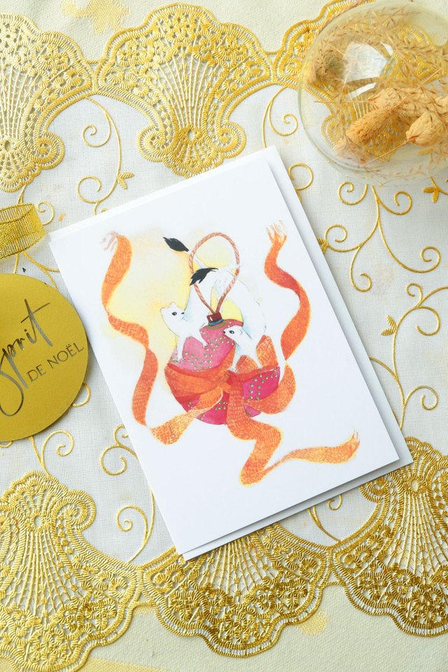 Reproduction d'une illustration réalisée à l'aquarelle représentant deux hermines sur une boule de Noël. L'hermine, en hiver, change de couleur de pelage et se fond avec la neige. Seul le bout de sa queue reste noir, lui donnant la forme d'un pinceau...Cette carte accompagnera un cadeau ou vos voeux avec légèreté et humour.