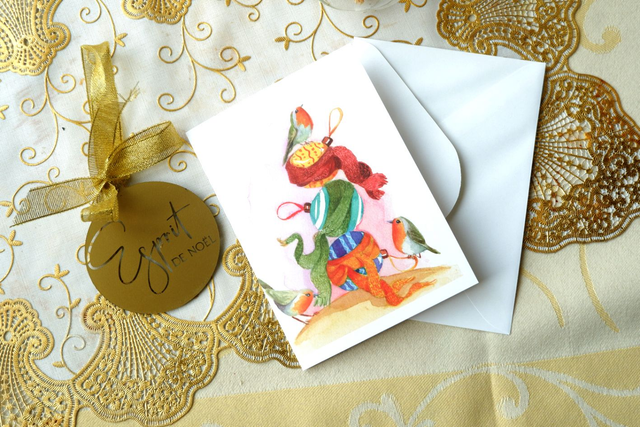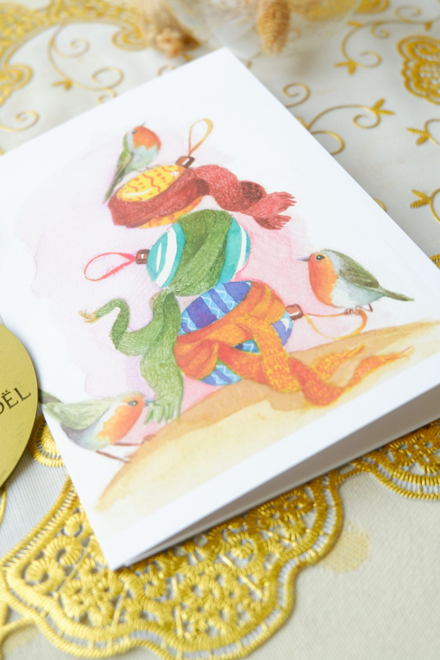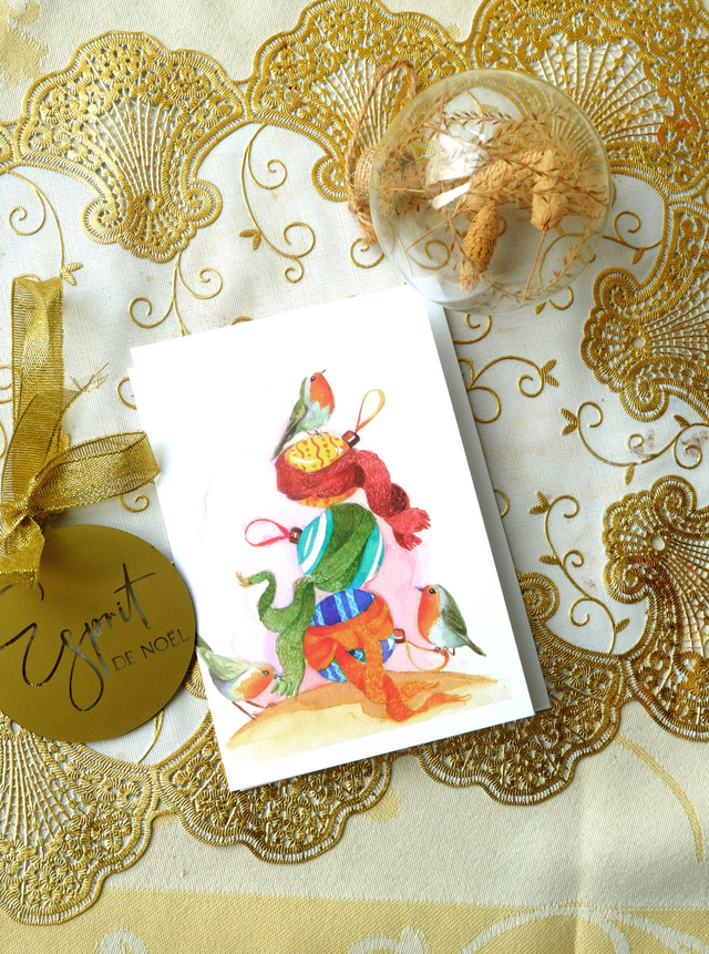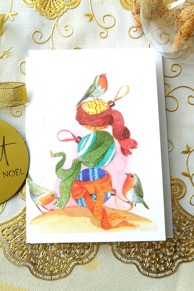 Reproduction d'une illustration réalisée à l'aquarelle, représentant trois rougegorges sur des boules de Noël. Le rougegorge nous ravit les pupilles en hiver avec son plastron de couleur orange vif. Quoi de mieux pour accompagner les longues journées d'hiver? Cette carte accompagnera joliment vos cadeaux et vos voeux.