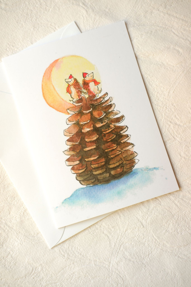 • Il s'agit d'une reproduction d'une illustration réalisée à l'aquarelle. Elle représente deux hérissons perchés au sommet d'une pomme de pin, avec la lune en arrière-plan. Pleine de douceur, cette carte ravira petit et grand, et tous les amoureux des hérissons, bien entendu.