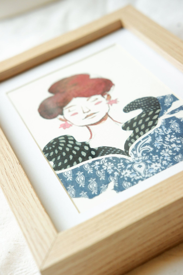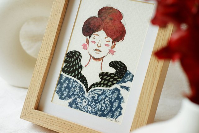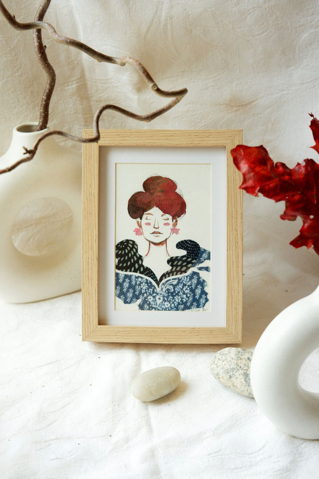 C'est une illustration originale et donc unique d'une femme au cheveux rouge réalisée en technique traditionnelle à l'aquarelle et au papier découpé. Envoyée encadrée, elle est prête à être accrochée sur vos murs ou poser sur vos étagères, sans attendre des mois, voire des années, avant de trouver son cadre... Sa taille passe-partout lui permet de trouver sa place dans tout type de lieu.