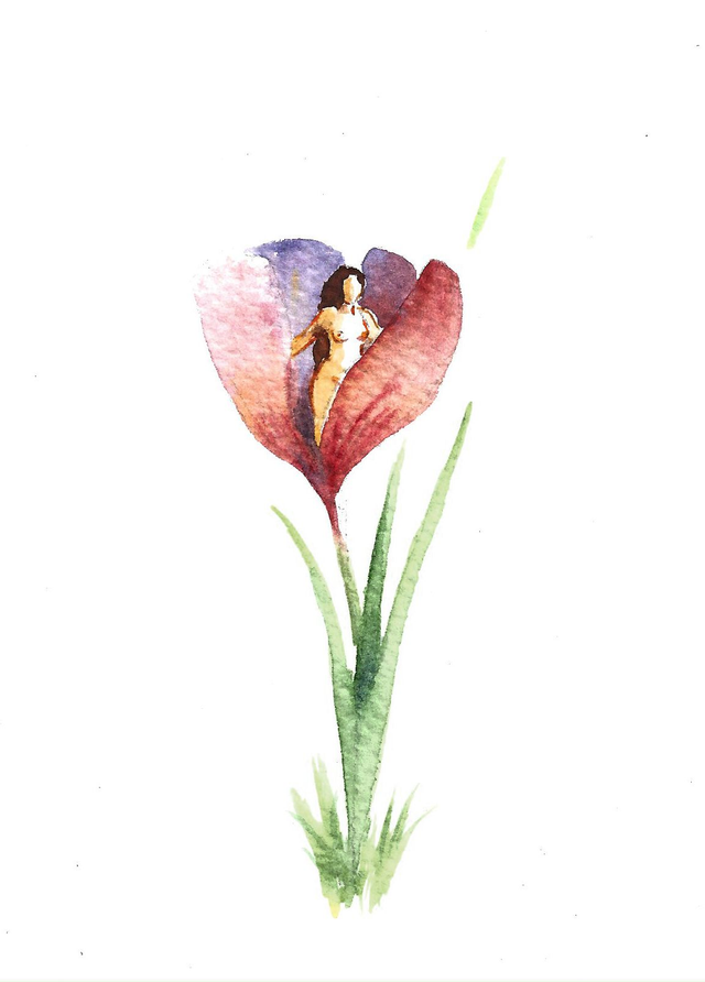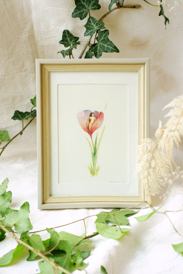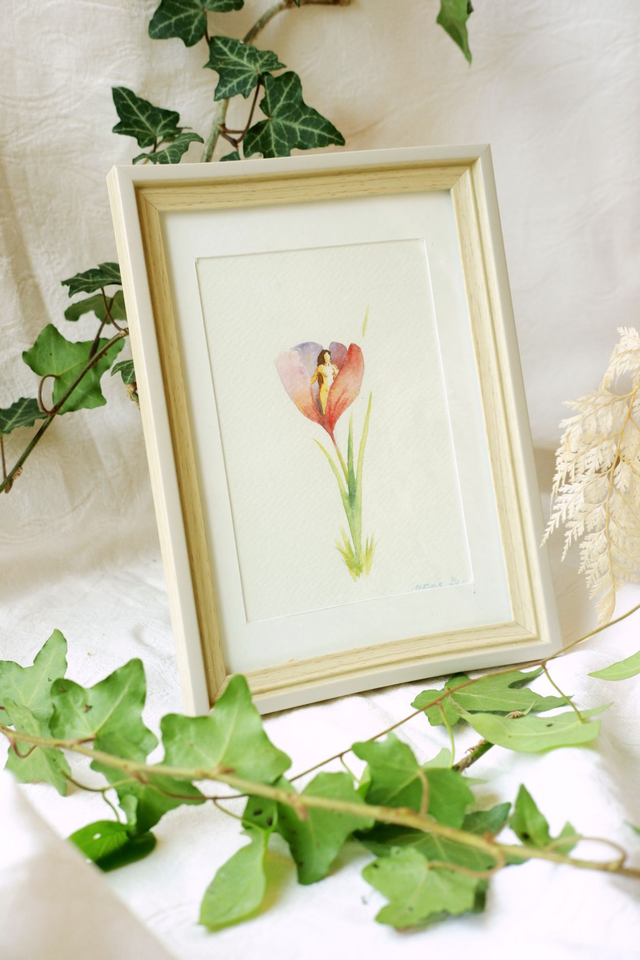 Il s'agit d'une illustration originale réalisée à l'aquarelle, représentant une femme dans une fleur. Elle est prête à se retrouver dès réception à orner vos murs ou vos étagères, un rappel à la nature, la vie, la féminité...