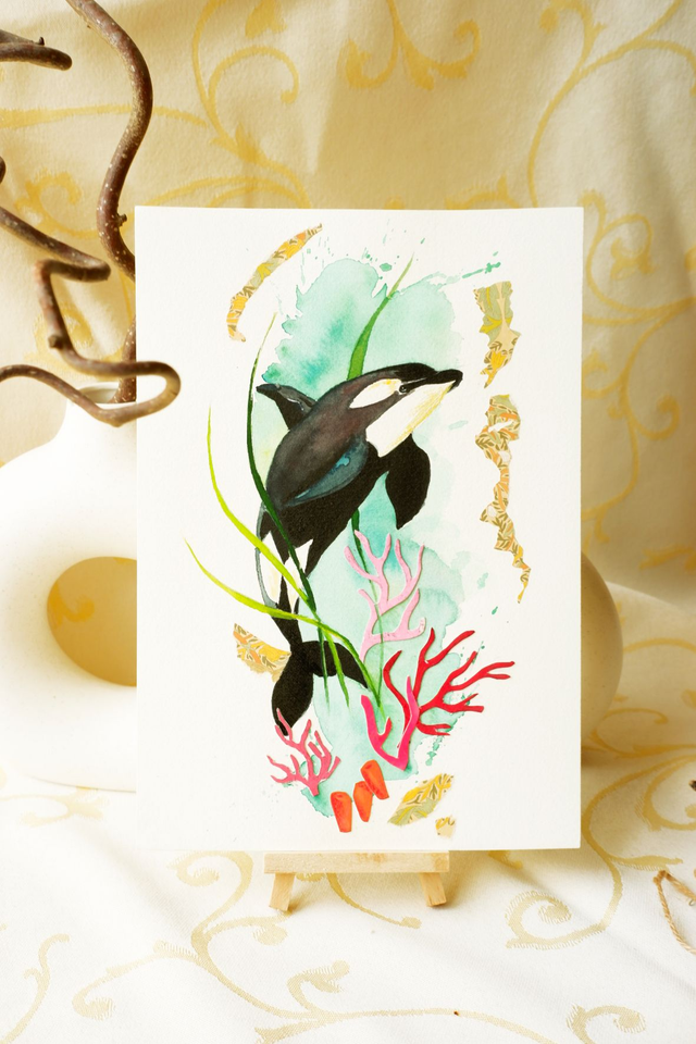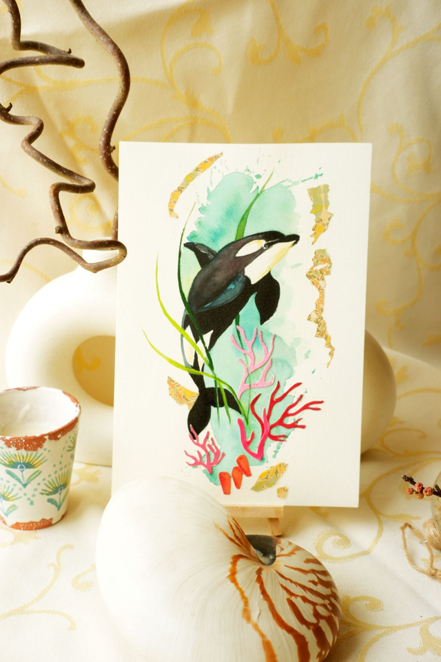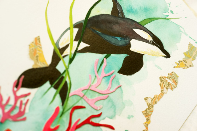 • Voici un beau portrait d'orque, réalisé à la gouache et au papier découpé. L'océan me fascine et j'aime représenter l'eau, la mer, les coraux dans mes oeuvres. Continuez le voyage en embarquant avec cet orque, jusqu'aux confins du monde...