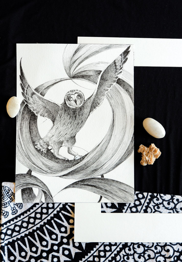 Illustration originale noir et blanc "Hibou des Marais"