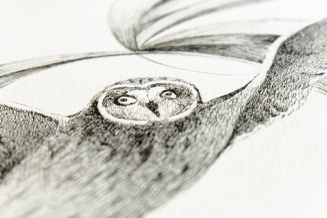 • Il s'agit d'une illustration originale et unique réalisée à la plume à l'encre de chine. Elle illustre un hibou des marais qui étend ses ailes.