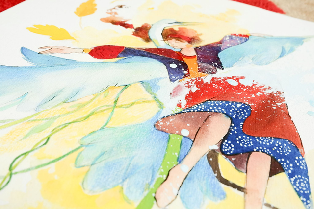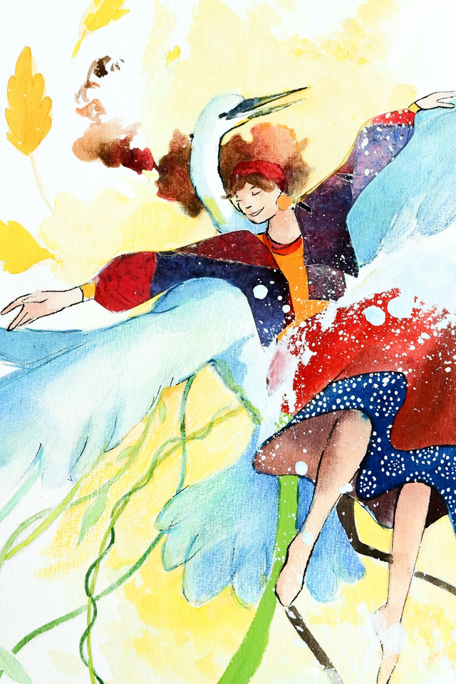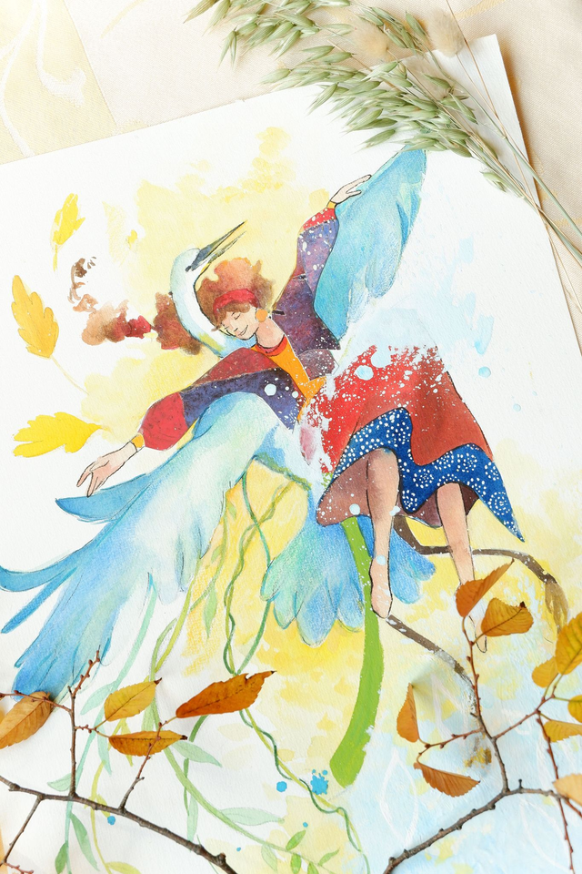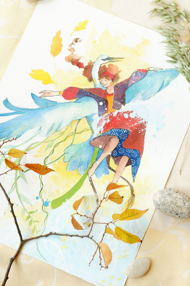 Illustration originale technique mixte "L'aigrette et la danseuse"
