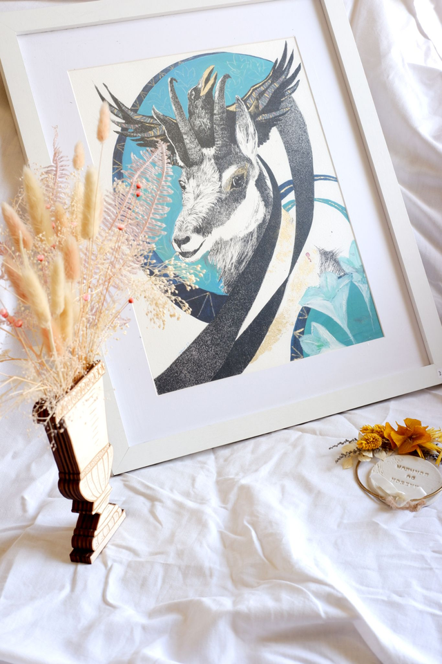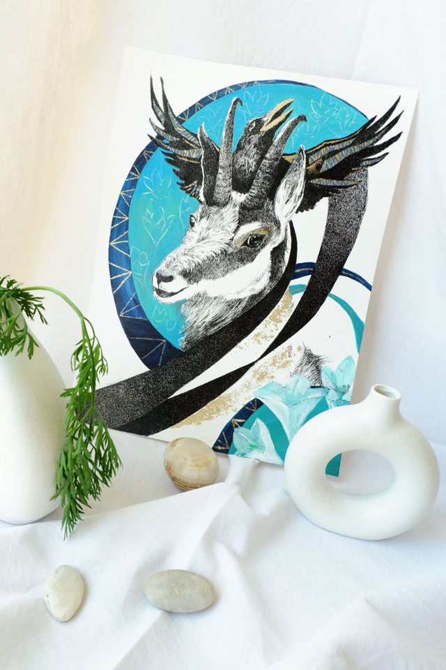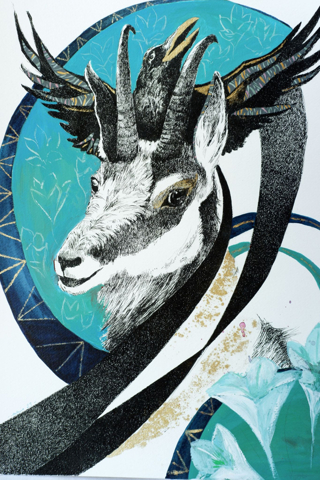Il s'agit d'une illustration originale et unique, réalisée à la plume à l'encre de chine, à la gouache et au papier découpé. Elle représente le portrait d'un chamois surmonté par un corbeau ouvrant grand ses ailes. Elle fait partie d'une collection sur les animaux visibles sur nos territoires. Le chamois est facilement visible et peu farouche, car plus chassé. Cela reste un bonheur de voir son museau joliment masqué et ses grands yeux.