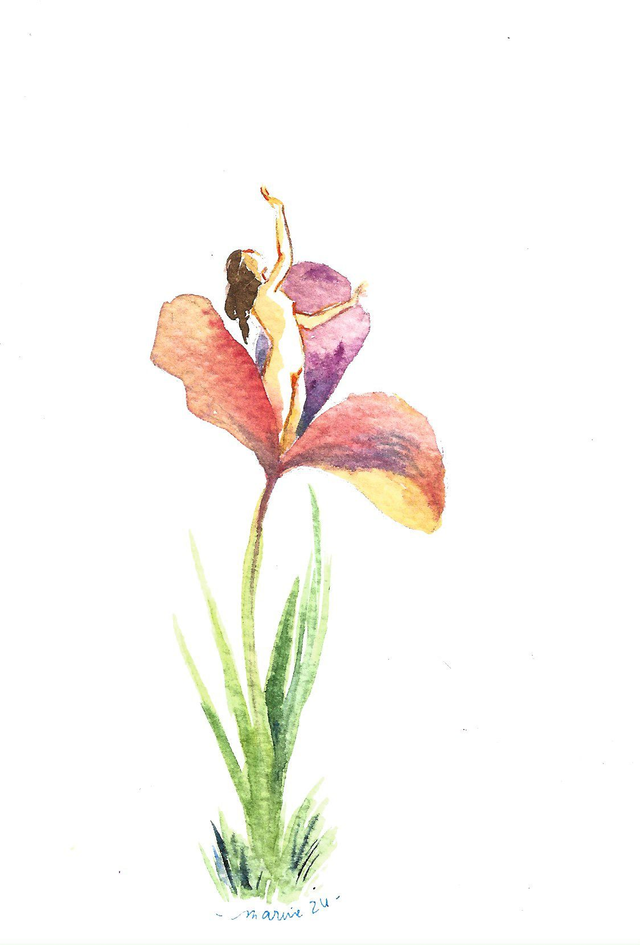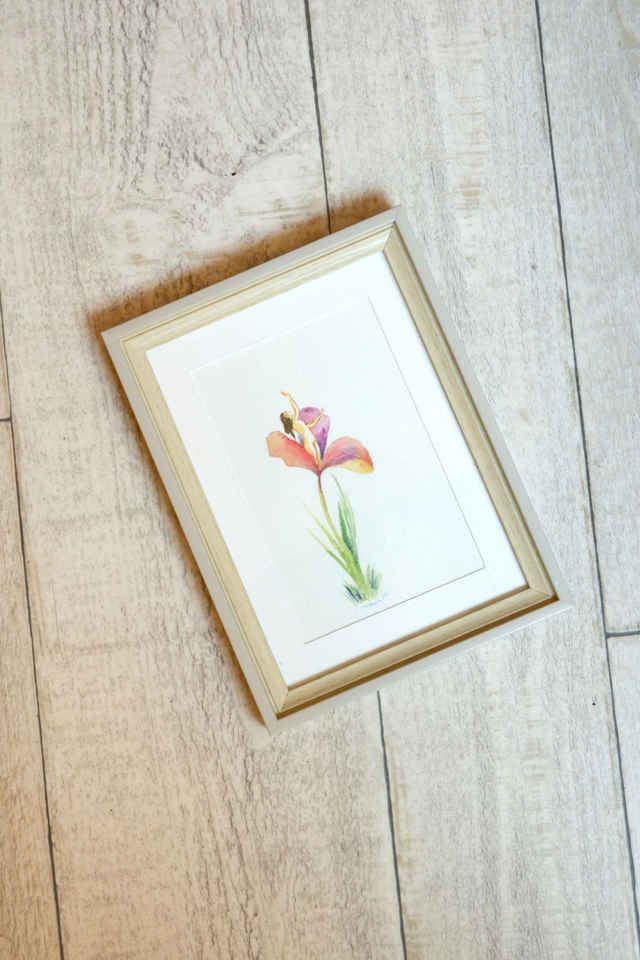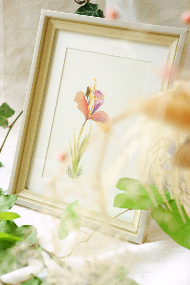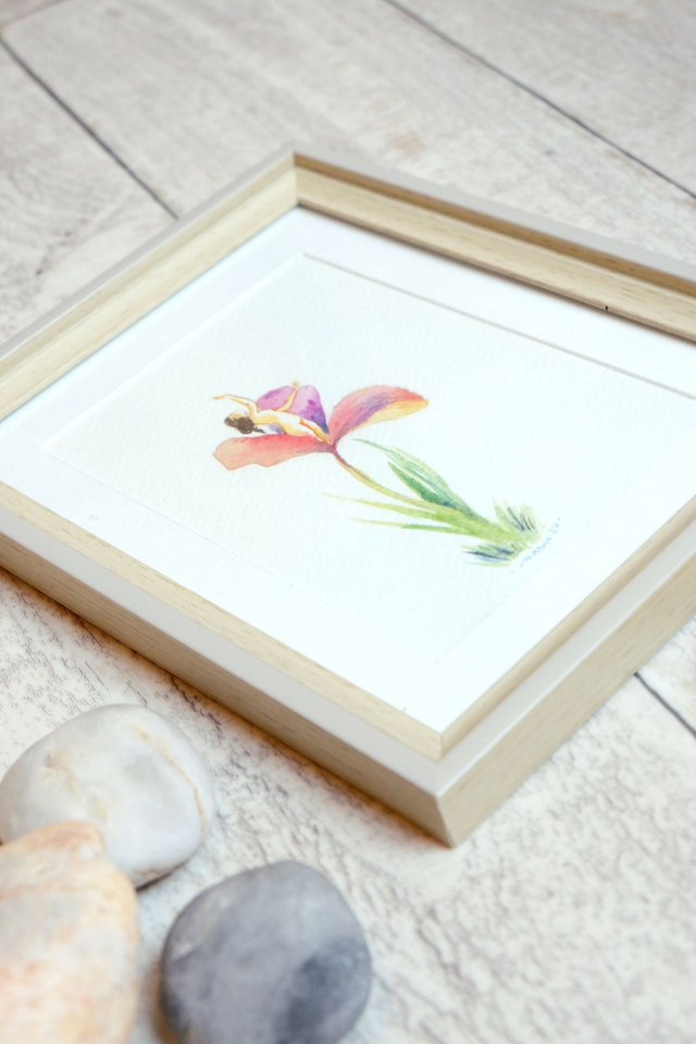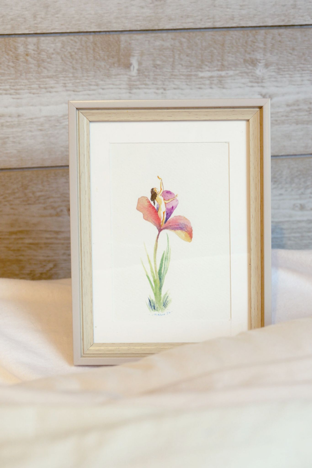 Il s'agit d'une illustration originale à l'aquarelle représentant une femme dansant dans une fleur. Douce et poétique, elle saura trouver sa place dès réception, au mur ou sur une étagère, pour une ode à la nature, la douceur...