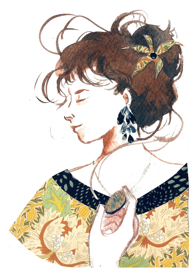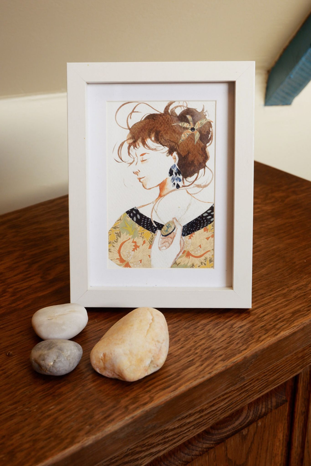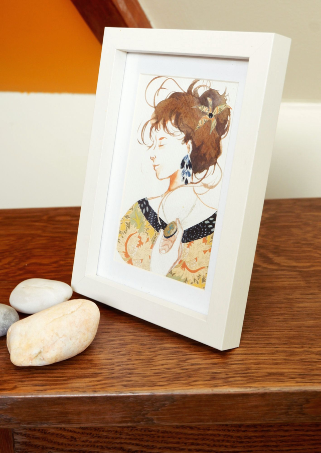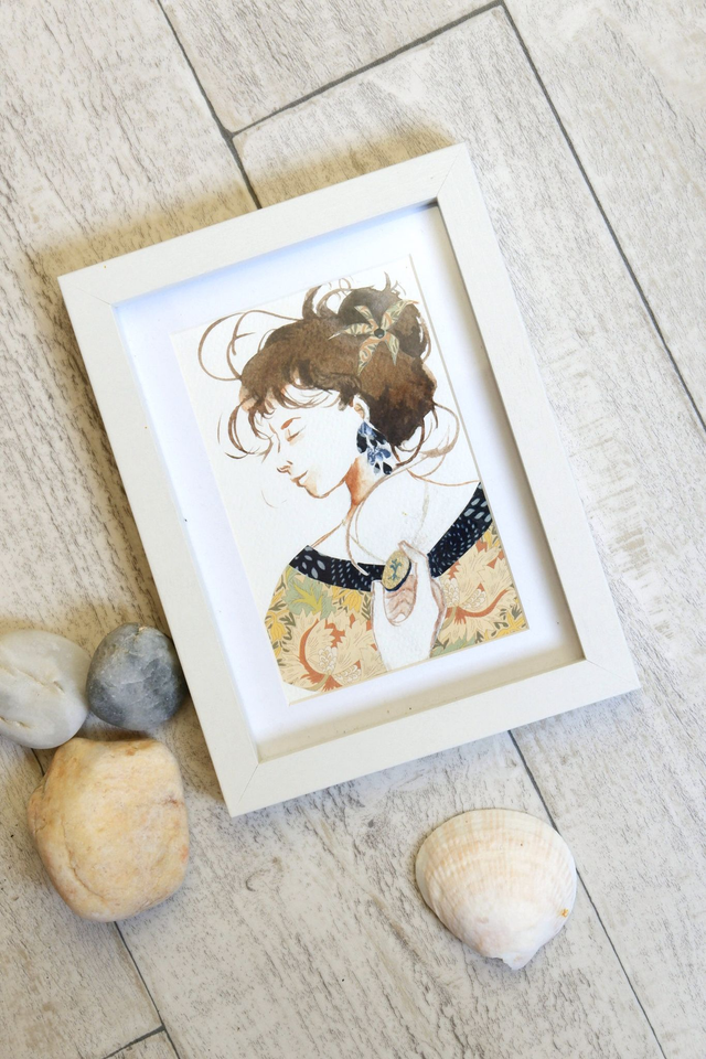 Il s'agit d'une illustration originale réalisée en technique mixte, avec de l'aquarelle, du papier découpé et de la poudre de bronze dorée. Elle représente une femme tenant un médaillon. Cette oeuvre d'art saura trouver, dès réception, sa place sur vos murs ou vos étagères.