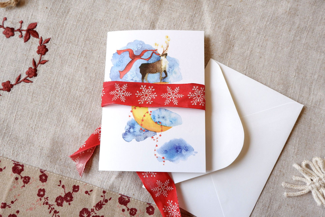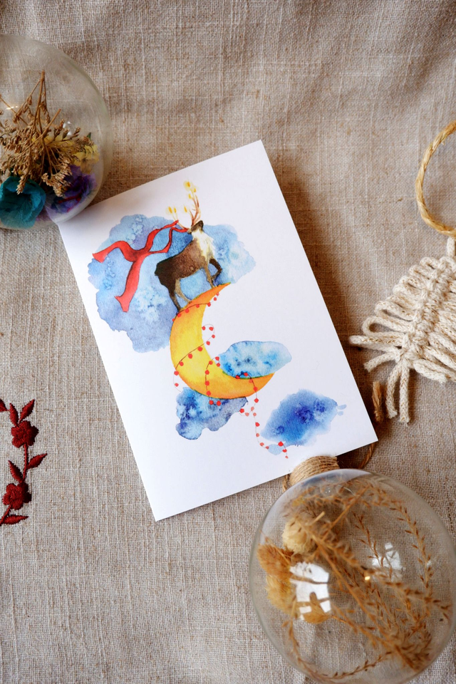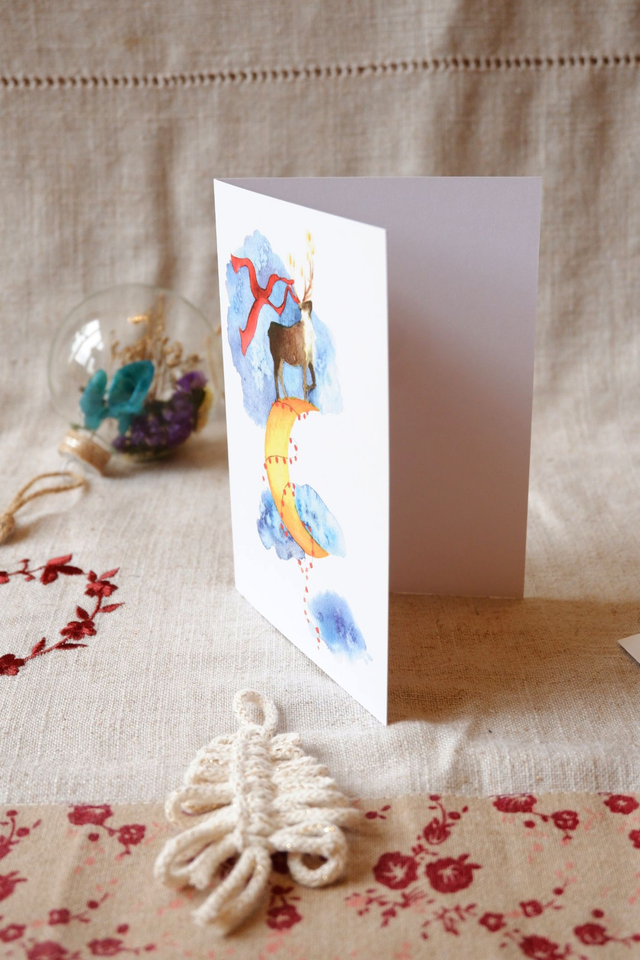 Voici le renne sur la lune, une des deux illustrations des cartes de voeux 2024, réalisée à l'aquarelle et imprimée sur du beau papier mat 300 gr blanc. Fêtez les fêtes en légèreté, accompagnez vos cadeaux ou vos bons voeux avec cette carte unique!