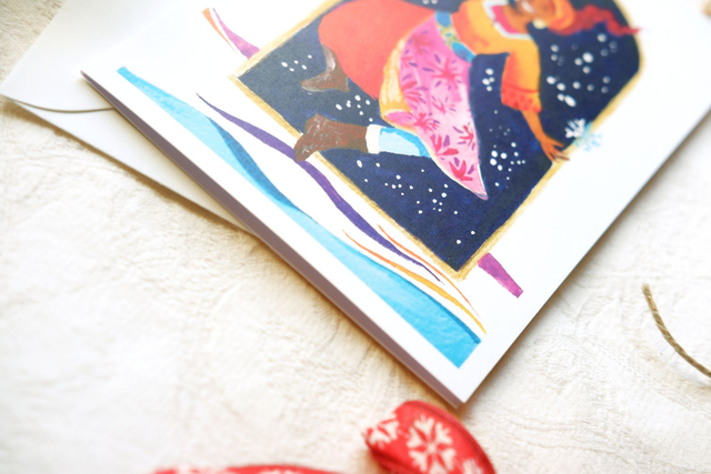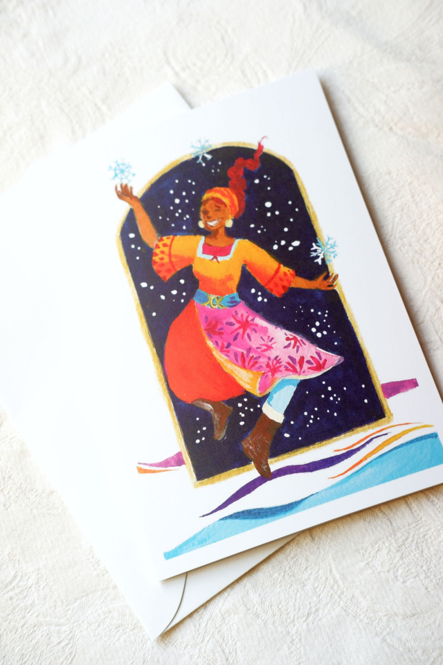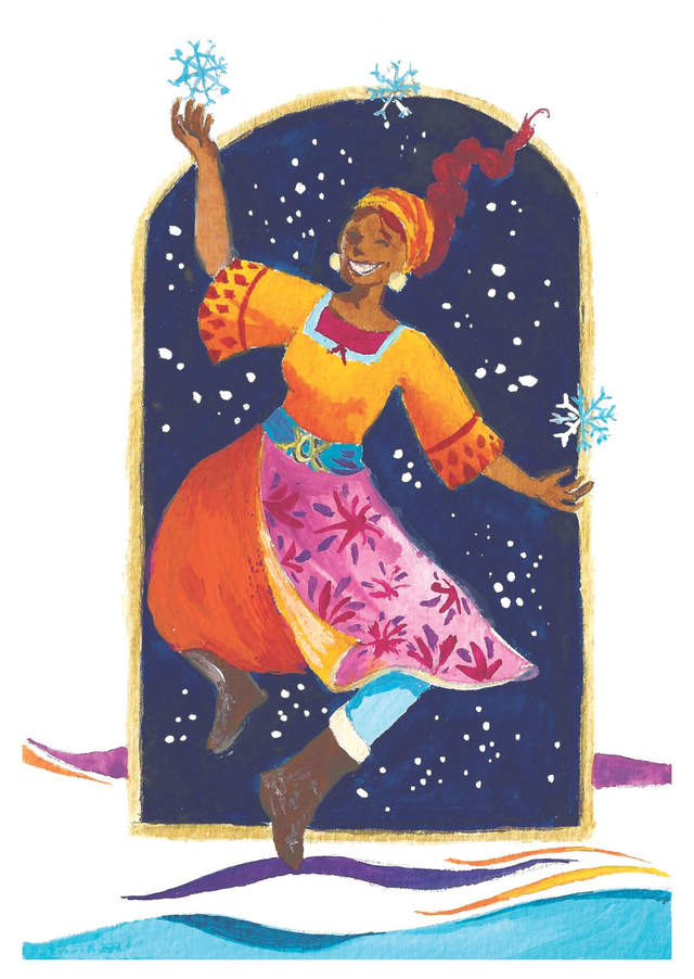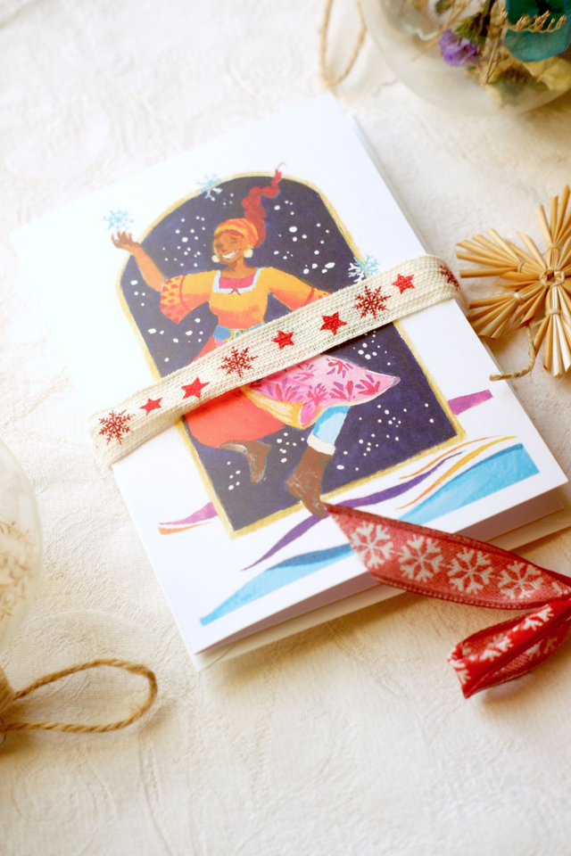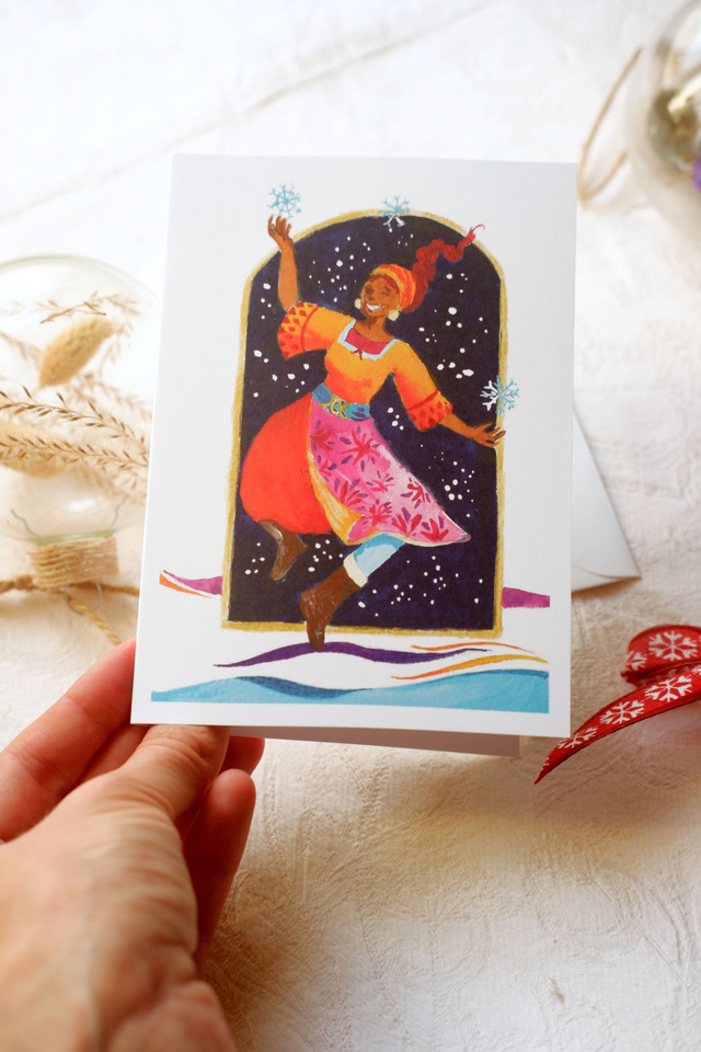 • Il s'agit d'une reproduction d'une illustration à la gouache, spécialement imaginée et réalisée pour les cartes de voeux . Elle représente une jeune femme dans des tenues colorées qui jongle avec des flocons. Quoi de mieux pour fêter l'hiver? Apportez de la joie et de la couleur pour les fêtes de fin d'année avec cette jolie danseuse!