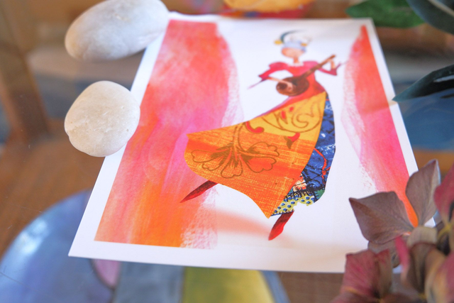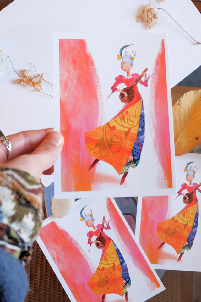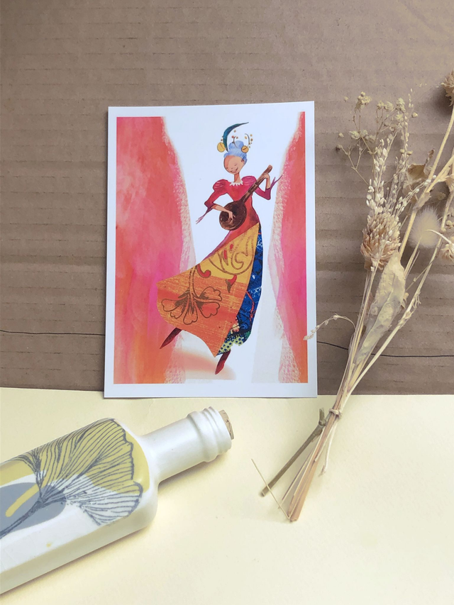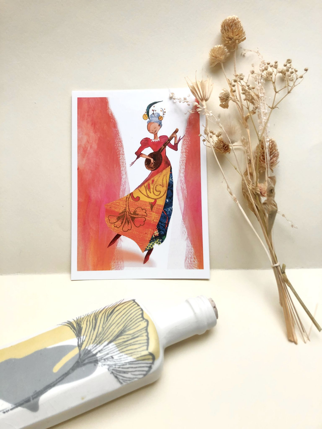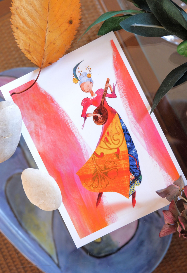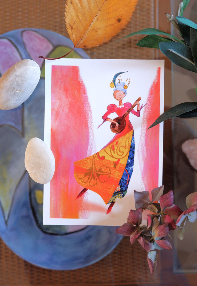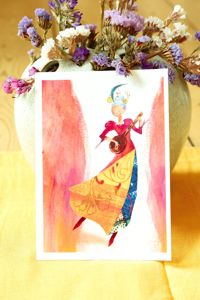 Il s'agit d'une création réalisée à partir d'une illustration à l'aquarelle et au papier découpé, que j'ai ensuite retravaillée sur ordinateur. Cette illustration a fait partie d'une série sur les musiciennes.