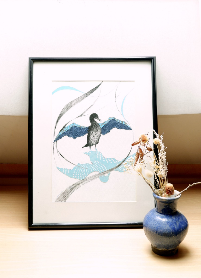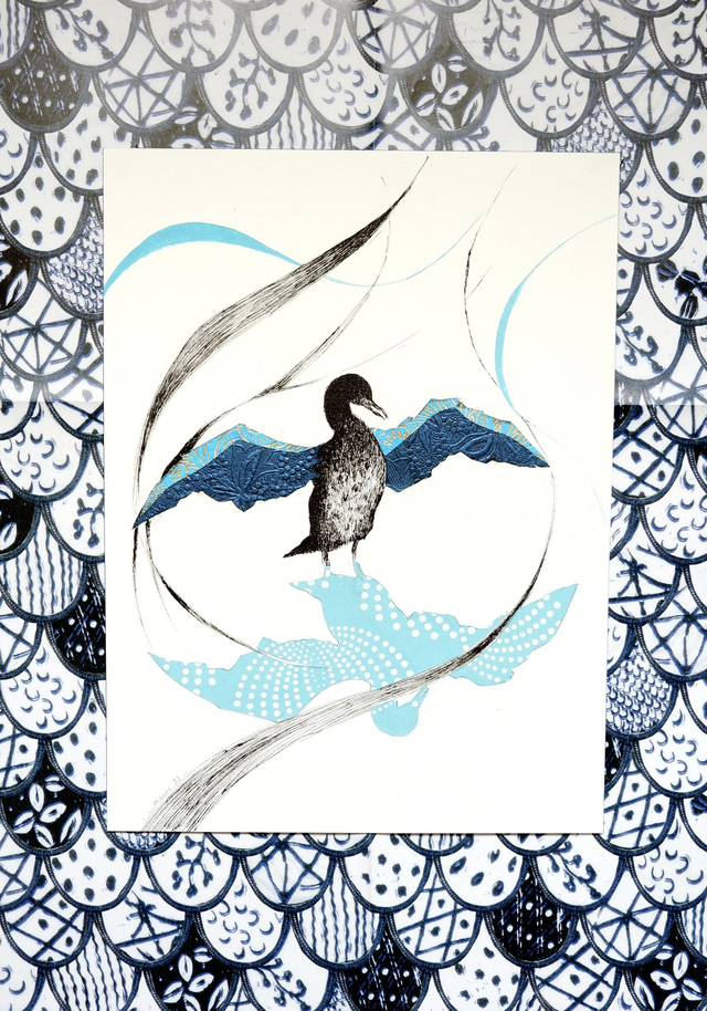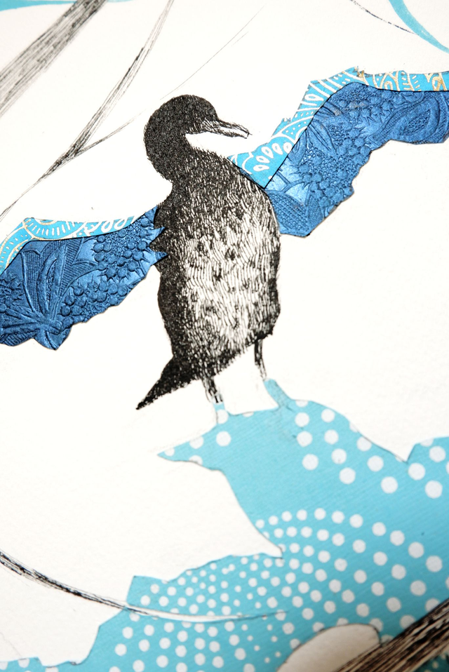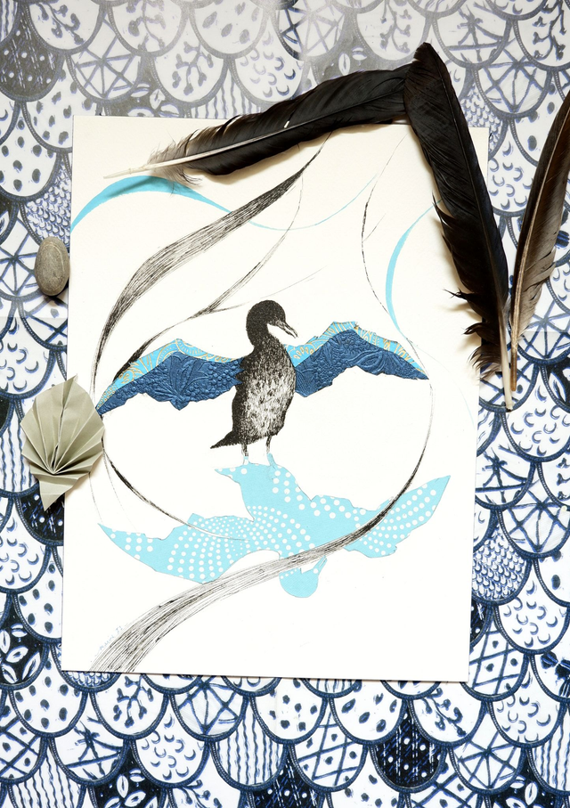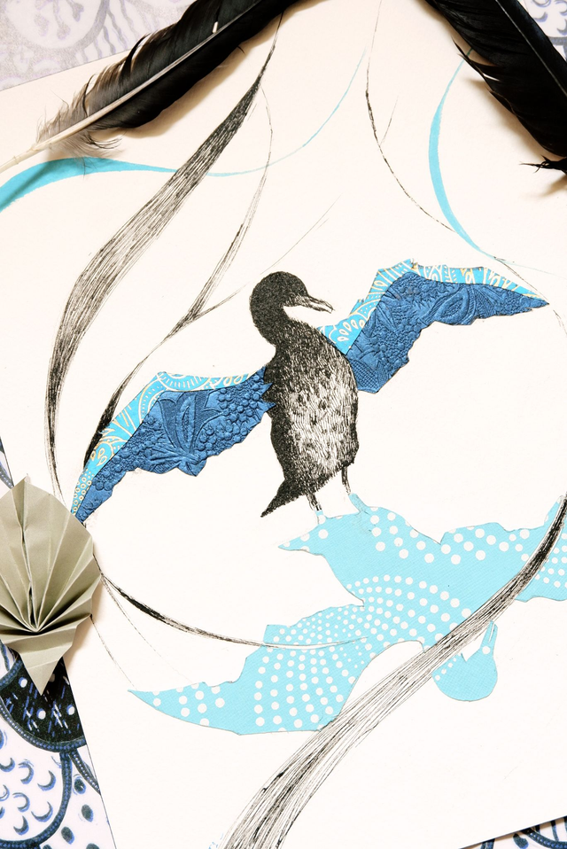 • Il s'agit d'une illustration originale, donc unique, réalisée à la plume à l'encre de chine et au papier découpé, représentant un cormoran qui se sèche les ailes.